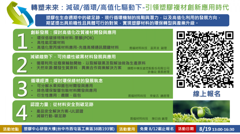 本次交流活動將展示塑膠在生命週期中的碳足跡、現行循環機制的挑戰與潛力,